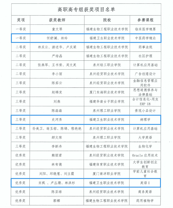 近日,由福建省高等教育学会、福建省高校在线教育联盟主办的“福建省高校第二届移动教学大赛”获奖结果公布,经过48所高校455个项目的角逐,确定本次大赛高职高专组一等奖2项、二等奖4项、三等奖8项、优秀奖12项。我院药学系何舒澜、林玲的参赛课程《中医药学概论》获一等奖,基础部史河秀的参赛课程《病理学》获三等奖,基础部宋枫、卢丛珊、林洪杉的参赛课程《英语Ⅰ》获优秀奖。