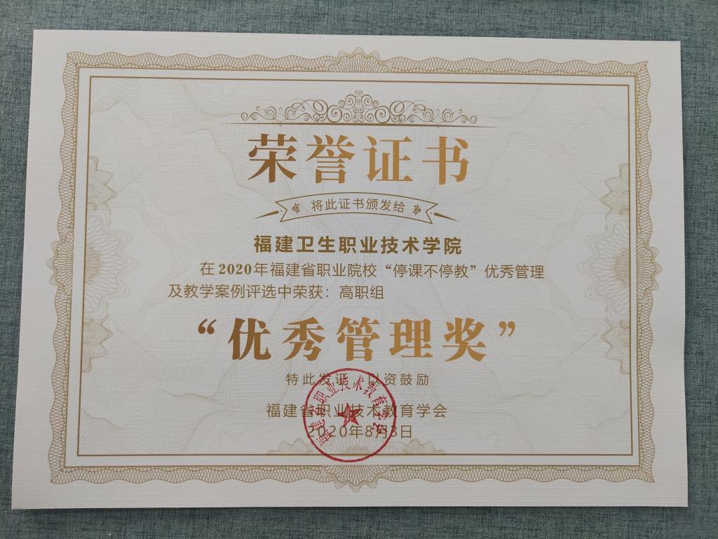 接福建省职业技术教育学会通知,我校在2020年福建省职业院校“停课不停教” 优秀管理及教学案例评选中荣获高职组“优秀管理奖”。