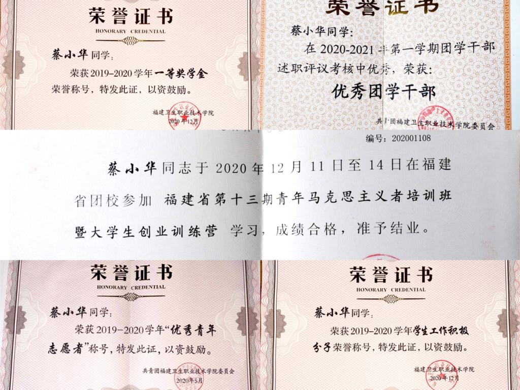 蔡小华,女,汉族,共青团员,福建卫生职业技术学院2019级药学专业学生,现任福建卫生职业技术学院学生会执行主席。她是一个理想信念坚定,作风优良,讲奉献、能担当、有情怀的青年马克思主义者,自觉学习与践行习近平新时代中国特色社会主义思想,政治素养高。在校期间先后获得业余分党校“优秀学员”“优秀青年志愿者”“学生工作积极分子”“优秀团学干部”等荣誉称号。