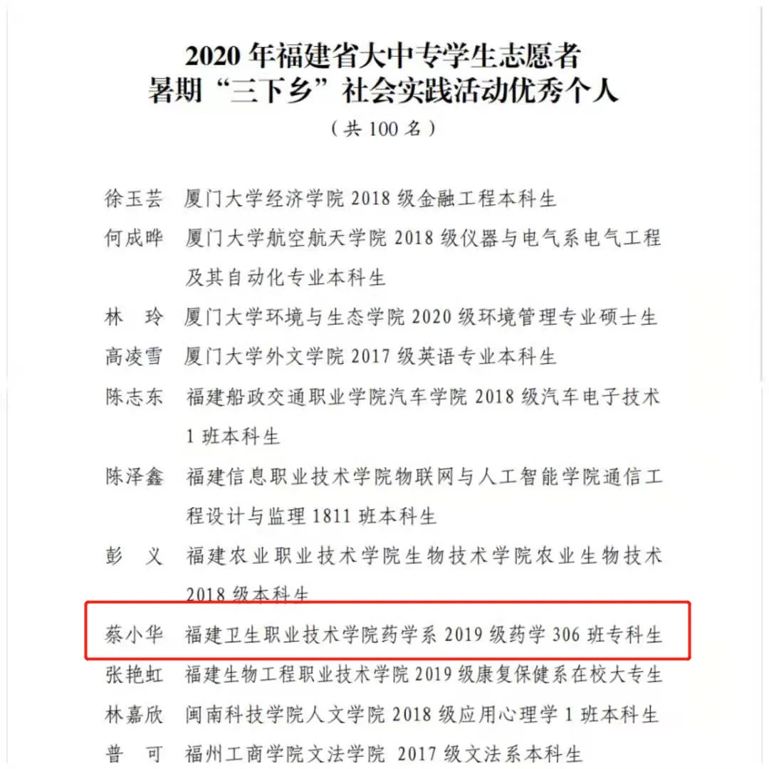 根据《关于开展2020年度“福建省优秀共青团员”“福建省优秀共青团干部”“福建省五四红旗团委(团支部)”评选表彰的通知》和《共青团福建省委 福建省青年联合会关于开展第十八届“福建青年五四奖章”评选表彰活动的通知》要求,对2020年度“两红两优”集体和个人进行了表彰。我校2019级药学专业学生蔡小华荣获2020年度“福建省优秀共青团员”。