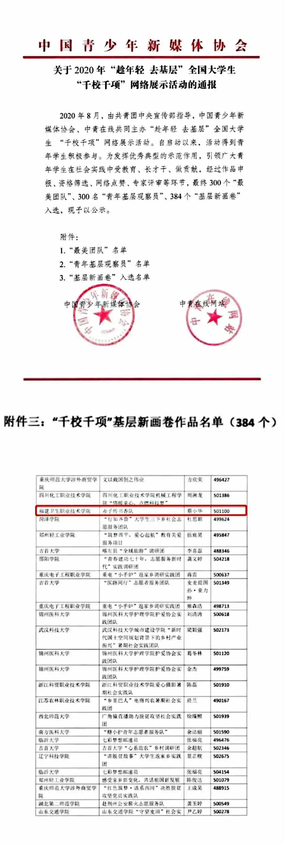 疫情期间她带领暑期社会实践小队参加“八闽青春献祖国”“我的返家乡实践故事”“镜头中的三下乡”等系列线上活动以及线下家乡云组队宣讲活动,在微博发表活动成果视频获得10225次阅读量;4个团队事迹入选活动专栏,在中青网发表5篇报道;3个团队入围2020全国大学生“千校千项”网络活动遴选展示,并入选2020年全国大学生“千校千项”最美团队、基层新画卷名单;个人荣获2020年福建省大中专学生志愿者暑期“三下乡”社会实践优秀个人、2020年全国大学生“千校千项”基层新画卷;团队荣获学院暑期社会实践优秀团队荣誉称号、“三下乡”社会实践活动先进个人、暑期社会实践优秀实践成果等荣誉称号。