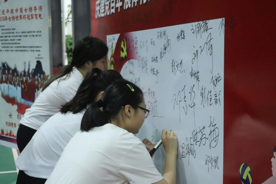 赛前的开幕仪式上,师生一起聆听了中国女排砺9成金辉煌的夺冠征程和习近平致中国女排夺得2019年女排世界杯冠军的贺电全文,团结协作、顽强拼搏的“女排精神”深入人心,大家踊跃签名表决心、显士气。