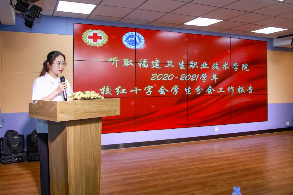 红十字会学生分会负责人卢龙婷作《“弘扬人道精神、凝聚青春力量”红十字会学生分会2020—2021学年工作报告》。报告指出,近年来我校红十字会学生分会在福建省红十字会的正确领导和红十字理事会的具体指导下,重整改革,优化治会,践行健康中国新理念,秉承“人道、博爱、奉献”的红十字精神,适应新形势,迎接新挑战,求真务实,锐意进取。乘风破浪,不负韶华,展示红十字会青年风采,红十字会学生分会采取多种活动形式,开展救死扶伤活动,激发广大同学的主动性、积极性和创造性,为同学服务,营造良好的校园文化氛围。