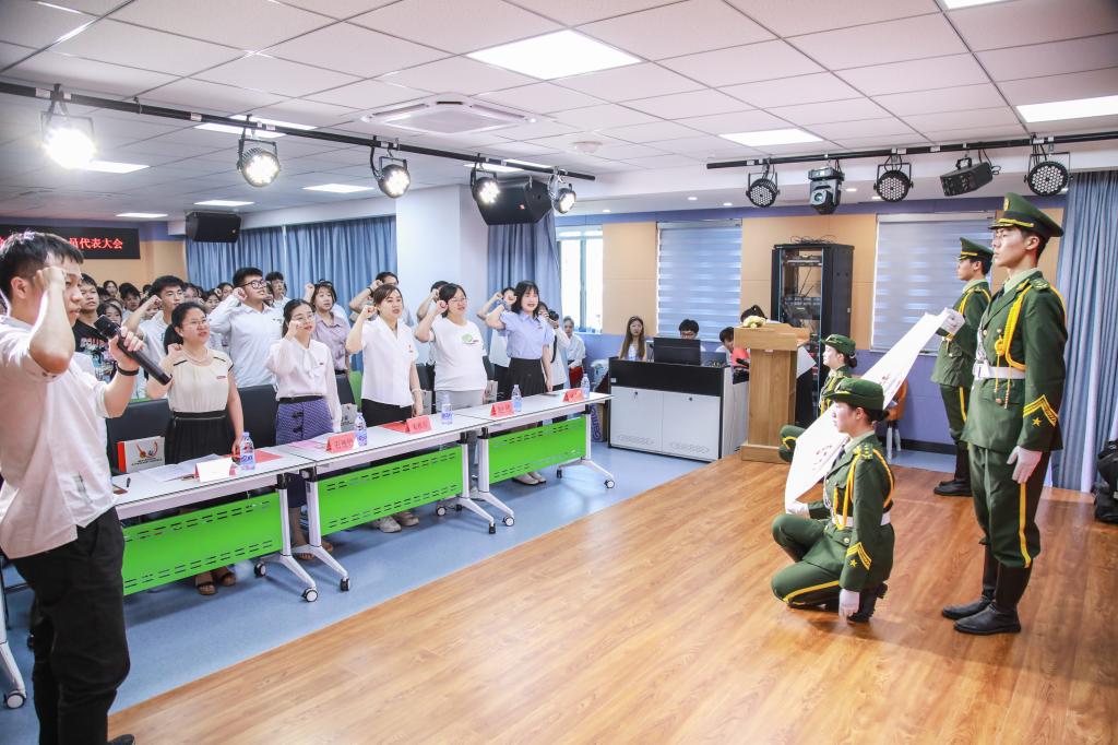 护理学院学生分会秘书长林飞准带领全体会员宣誓。铿锵有力的宣誓词响彻整个大厅,更坚定了与会会员的“人道、博爱、奉献”的红十字精神。