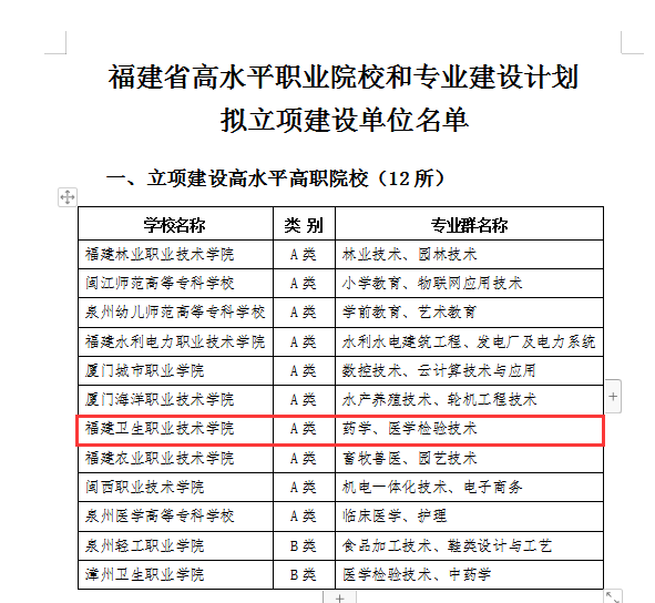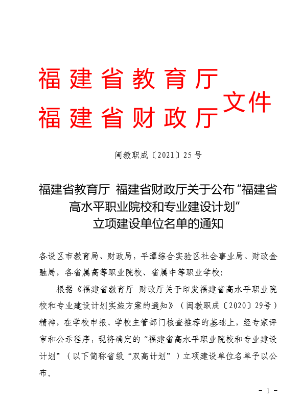 6月24日,省教育厅、财政厅公布“福建省高水平职业院校和专业建设计划”立项建设单位名单,我校入选A类高水平高职院校立项建设单位。