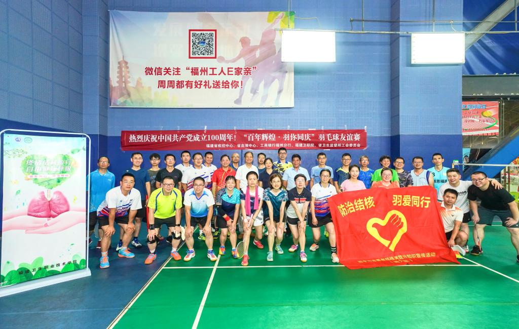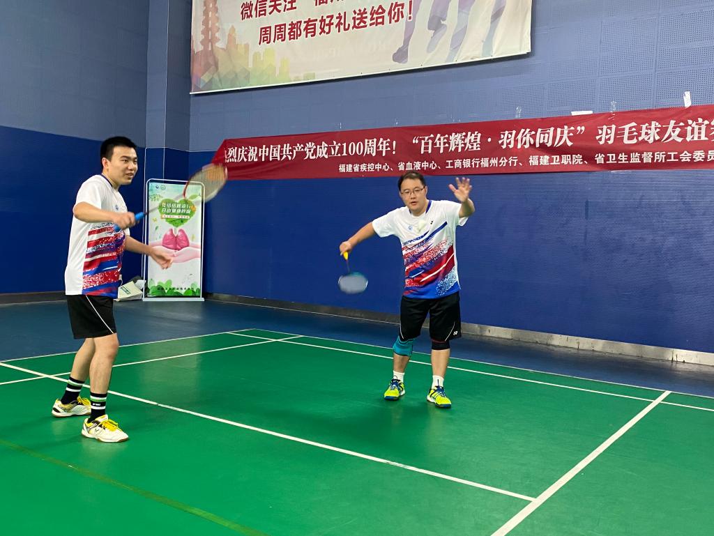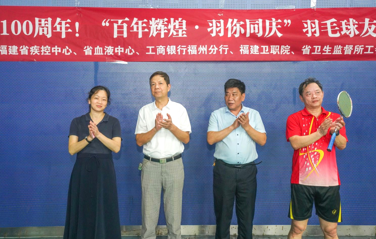 由我校工会与福建省疾病预防控制中心、福建省血液中心、中国工商银行福州分行、福建省卫生健康监督所联合举办庆祝中国共产党成立100周年“百年辉煌·羽你同庆”羽毛球友谊赛于6月29日晚在福州市工人文化馆羽毛球馆开幕。福建省血液中心王明主任、我校工会洪常青副主席和工商银行福州分行纪委书记、工委林丰主任先后致辞。