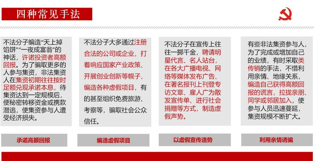 时刻谨记天上不会掉馅饼,掉下来的不是“圈套”就是“陷阱”,不盲目相信所谓的高息“保险”、高息“理财”等诱惑。大家要树立风险意识,注重信息保护,坚守住理性底线,牢记高收益意味着高风险,坚决对非法集资说“不”!