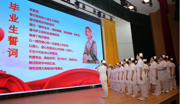 毕业生们手捧红烛,举起右手庄严宣誓:“……热爱专业,勤勉好学;忠于职守,兢兢业业;接过前辈手中的红烛,将毕生精力奉献给护理事业……”铿锵有力的声音久久萦绕在会场上空,昭示着她们正式加入白衣天使的行列。