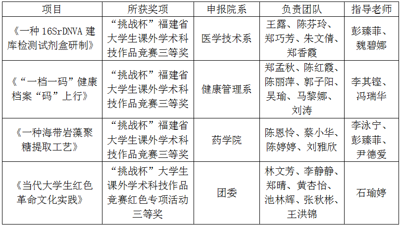 我校《一种16SrDNVA建库检测试剂盒研制》《“一档一码”健康档案“码”上行》和《一种海带岩藻聚糖提取工艺》共三个作品荣获“挑战杯”福建省大学生课外学术科技作品竞赛三等奖;《当代大学生红色革命文化实践》荣获“挑战杯”大学生课外学术科技作品竞赛红色专项活动三等奖。