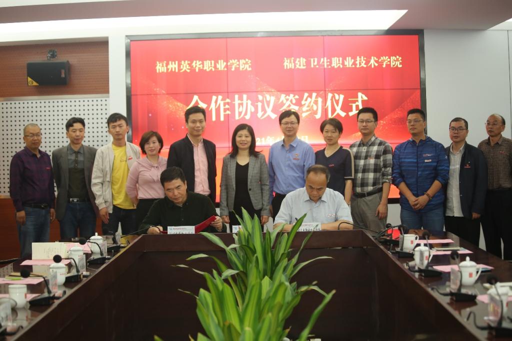 2021年4月27日上午,福州英华职业学院董事长江澜、院长彭文宇等一行8人莅临我校,并在行政楼第一会议室举行合作框架协议签约仪式。许能锋院长和彭文宇院长分别代表双方学校签订协议,党政办、学工部、教务处、人事处、后勤处、安全处等部门负责人参加签约仪式。