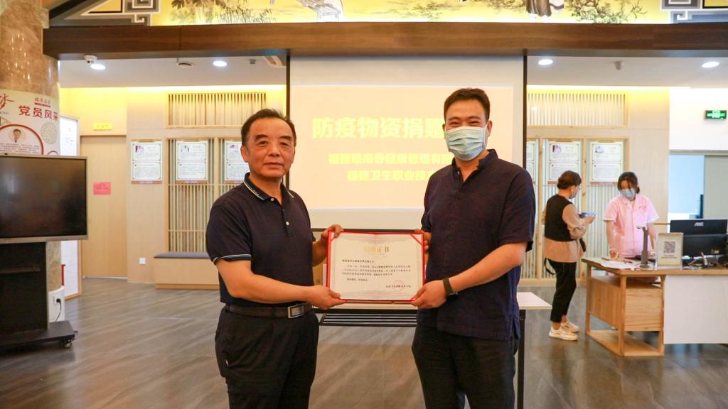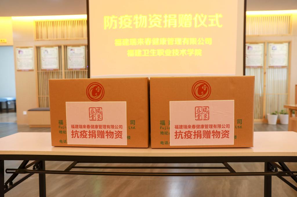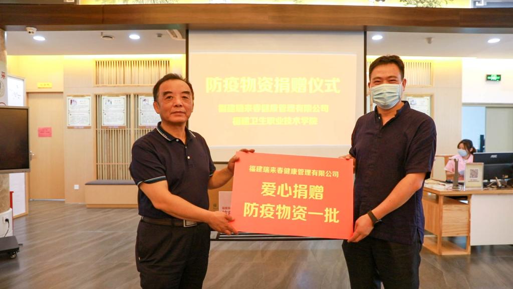 捐赠仪式由何舒澜主持,游锋代表我校接受福建瑞来春健康管理有限公司捐赠的一批防疫物资。