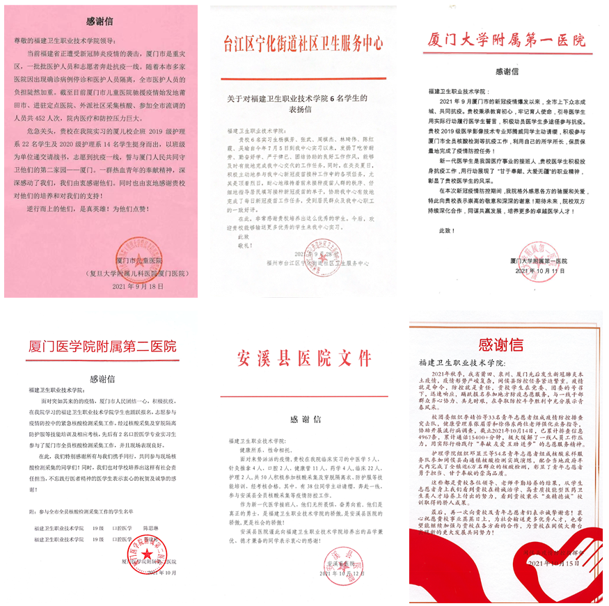 近日,我校先后收到来自厦门市儿童医院、宁化街道社区卫生服务中心、厦门大学附属第一医院、厦门医学院附属第二医院、安溪县医院、闽侯县疫情防控指挥部的感谢信,对疫情期间奋战在抗疫一线的我校青年志愿者进行表扬,对其主动投身疫情防控志愿服务及认真负责的工作态度给予高度肯定,同时对学校的人才培养工作表示感谢。