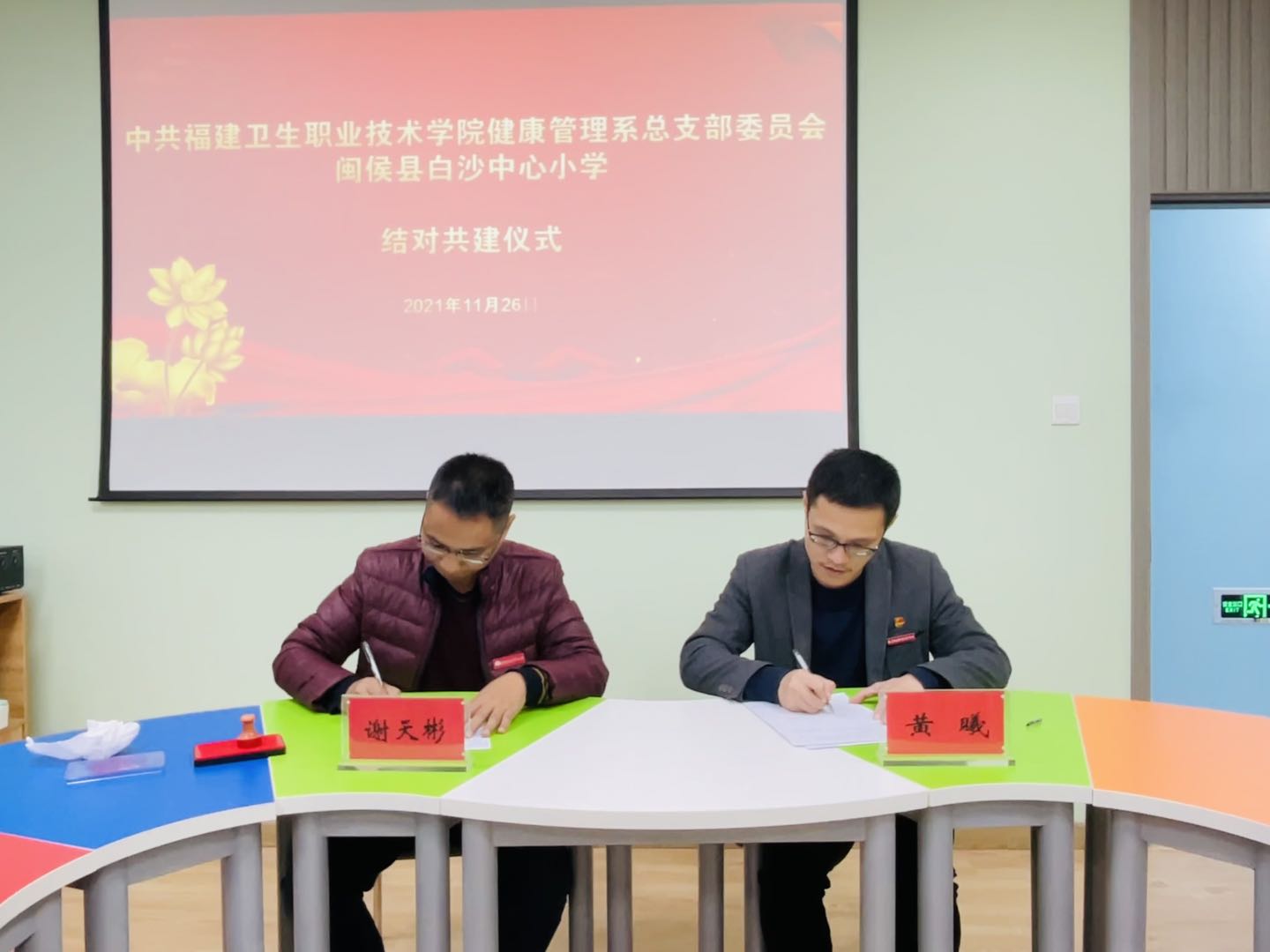 为持续深入开展党史学习教育,做到学史力行,强化“我为群众办实事”成效,11月26日,健康管理系党总支与闽侯县白沙中心小学在学生服务中心举行共建协议续签仪式。健康管理系党总支书记黄曦、副书记吴燕玲、2个学生支部书记,闽侯县白沙小学学区校长谢天彬、副校长陈由禅等参与会议。