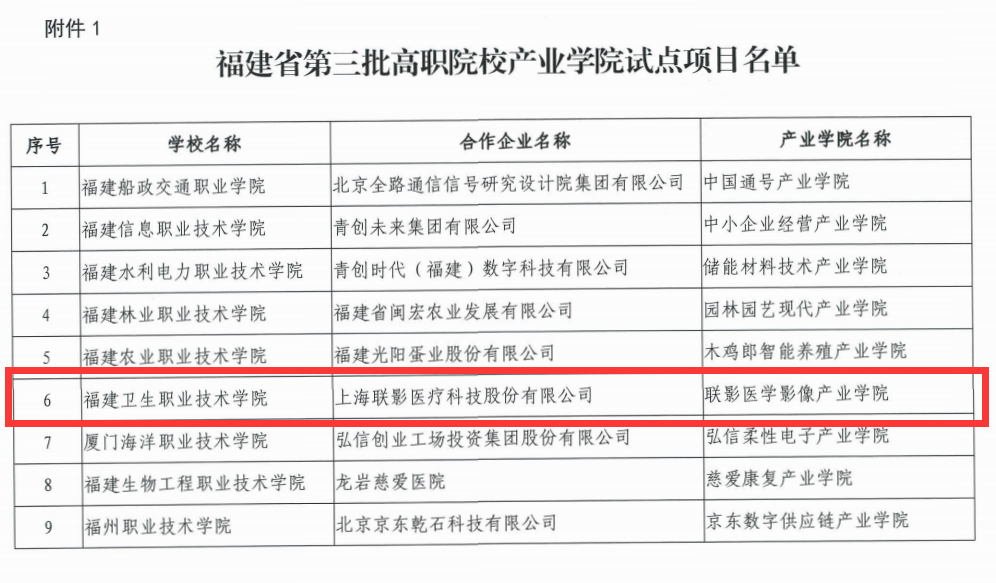根据《福建省教育厅关于公布福建省第三批高等职业院校产业学院试点项目的通知》,我校与上海联影医疗科技股份有限公司合作建立的联影医学影像产业学院成功入选福建省第三批高职院校产业学院试点项目,这是我校多年来坚持立德树人根本宗旨、落实产教融合创新发展的重要成果体现!