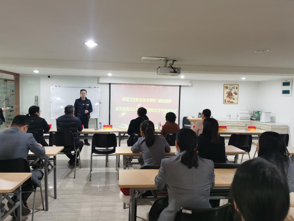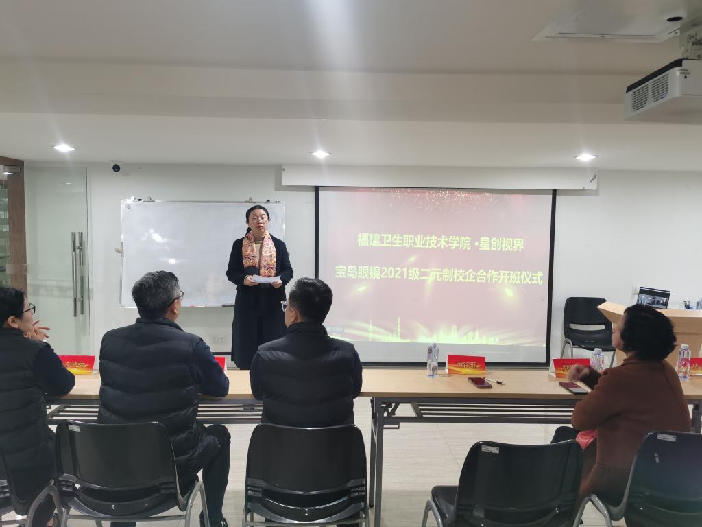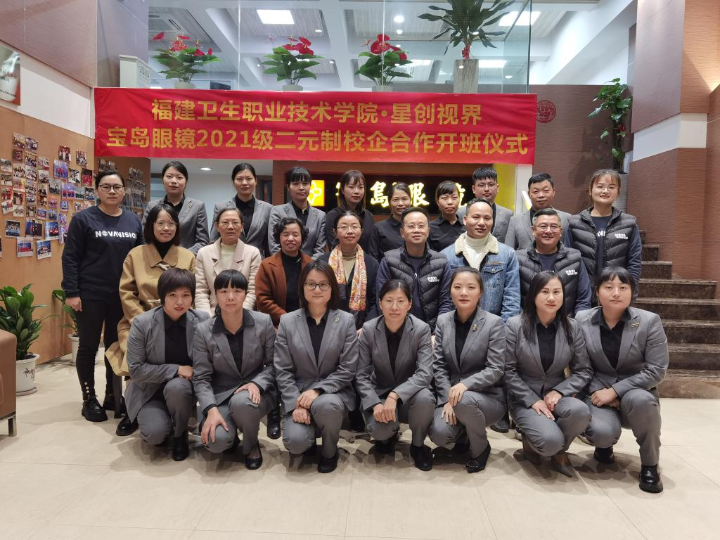 2021年12月31日,我校与星创世界宝岛眼镜联合举办2021级眼视光技术专业(二元制班)开班仪式。副校长黄铭珊,教务处、医学技术系相关负责人,宝岛眼镜泉州营运区总经理黄行杰等人员,以及全体二元制学员参加开班仪式。