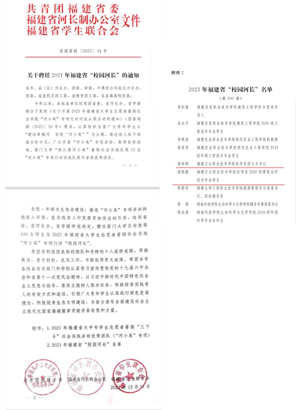 此外,共青团福建省委、福建省河长制办公室、福建省学生联合会下发《关于聘任2021年福建省“校园河长”的通知》,我校谢林辉老师、游晓捷同学被聘为福建省“校园河长”。