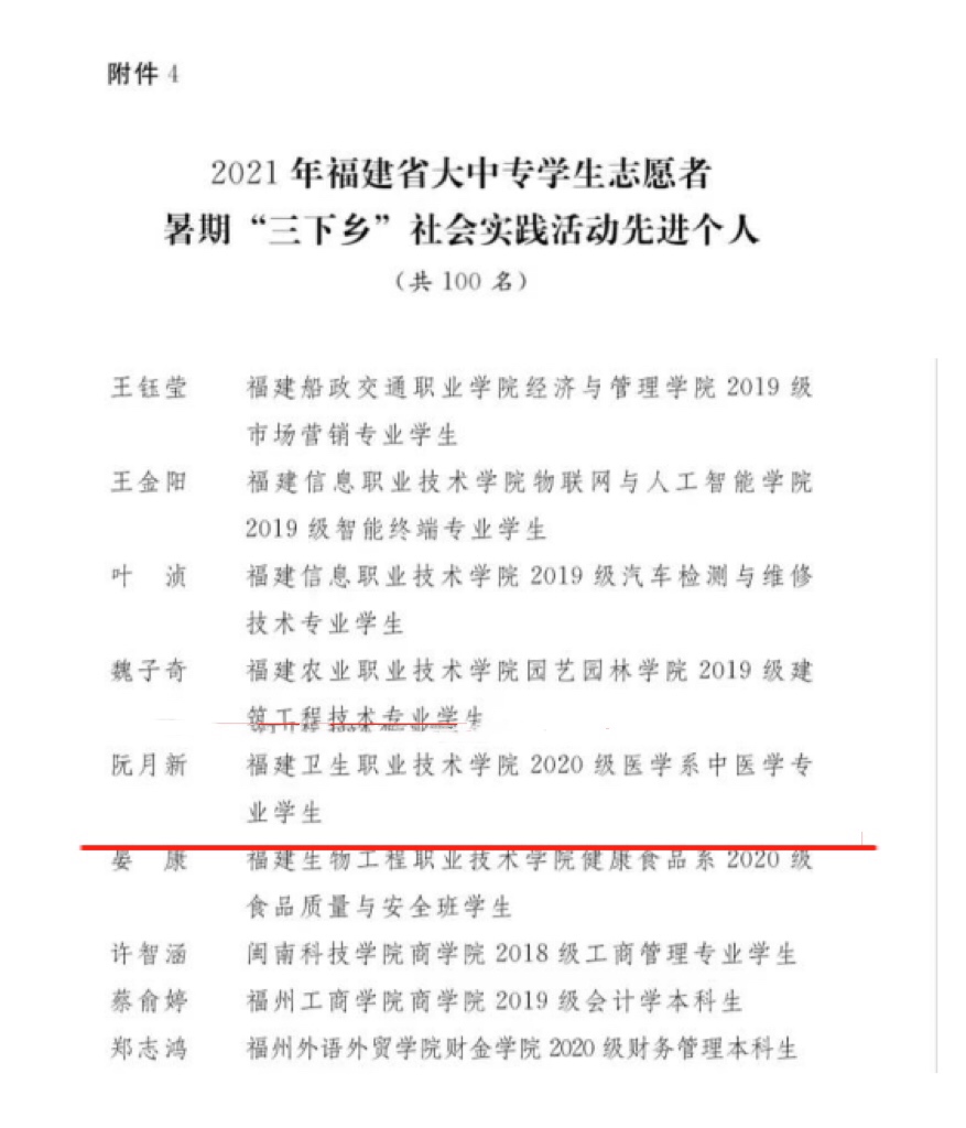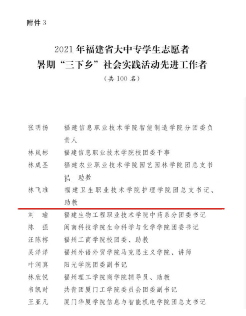 近日,中共福建省委宣传部、中共福建省委文明办、中共福建省委教育工委、福建省河长制办公室、共青团福建省委、福建省学生联合会联合下发《关于2021年福建省大中专学生志愿者暑期“三下乡”社会实践活动优秀集体和个人的通报》,我校被评为2021年福建省大中专学生志愿者暑期“三下乡”社会实践活动先进单位,这已是我校连续五年荣获此项荣誉。“遇践青春”社会实践队被评为福建省暑期“三下乡”社会实践活动优秀团队,林飞准老师获福建省暑期“三下乡”社会实践活动“先进工作者”称号,阮月新同学获福建省暑期“三下乡”社会实践活动“先进个人”称号。
