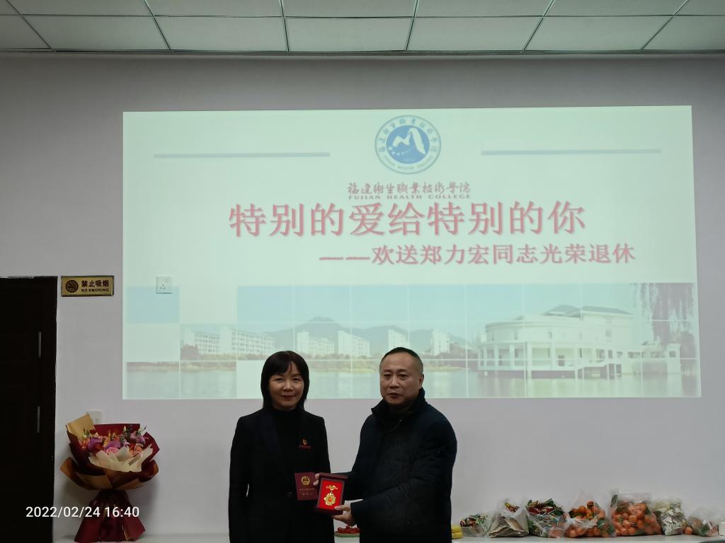 李美华代表学校向郑力宏颁发退休证书和退休纪念章。
