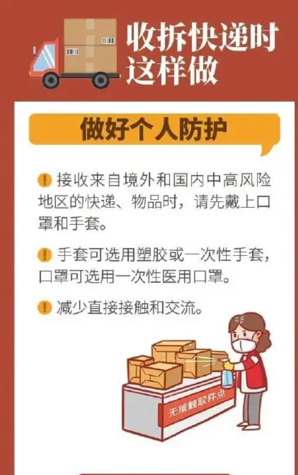 减少不必要网购,特别是不从中高风险区与国(境)外购物。在接收快递时,应全程佩戴口罩,建议先对外包装进行消毒,或者放置在通风有阳光处静置一段时间后再开包使用,拆包后的垃圾应按垃圾分类处理。处理完毕后,清洗消毒双手。如接收到涉疫快递,应主动报告辅导员,并配合排查工作。