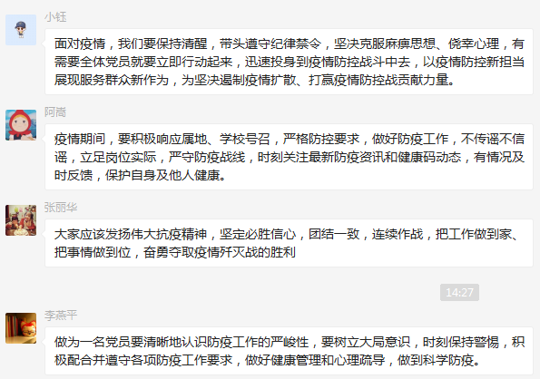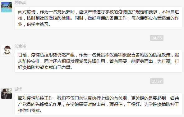 交流环节中,党员们畅谈心得体会,纷纷表示要认真贯彻学校疫情防控工作有关精神,大力宣传科学防疫措施,不造谣、不传谣,向身边亲友普及疫情防控知识,积极参与疫情防控工作,为坚决遏制疫情扩散,夺取疫情防控胜利贡献一份力量。