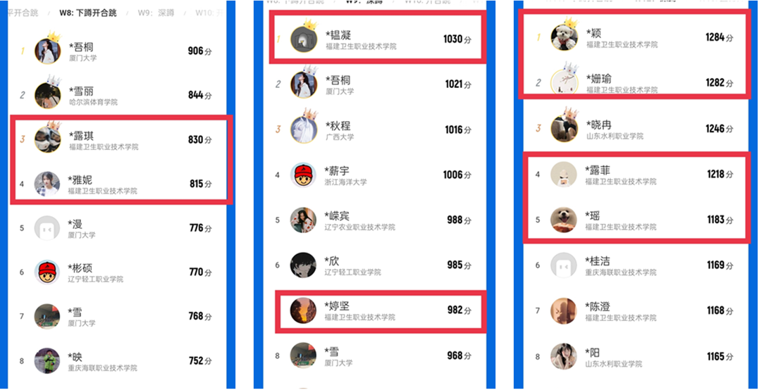 在体能赛周赛中,我校学生多次获得佳绩,在下蹲开合跳和深蹲项目中成绩尤为突出,多名同学名列前十榜内。