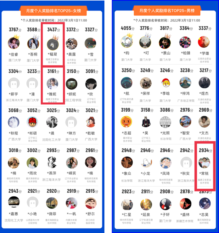 在体能赛月赛中,我校女生分别荣获第三名和第八名的成绩,男生也荣登全国前25名榜单。