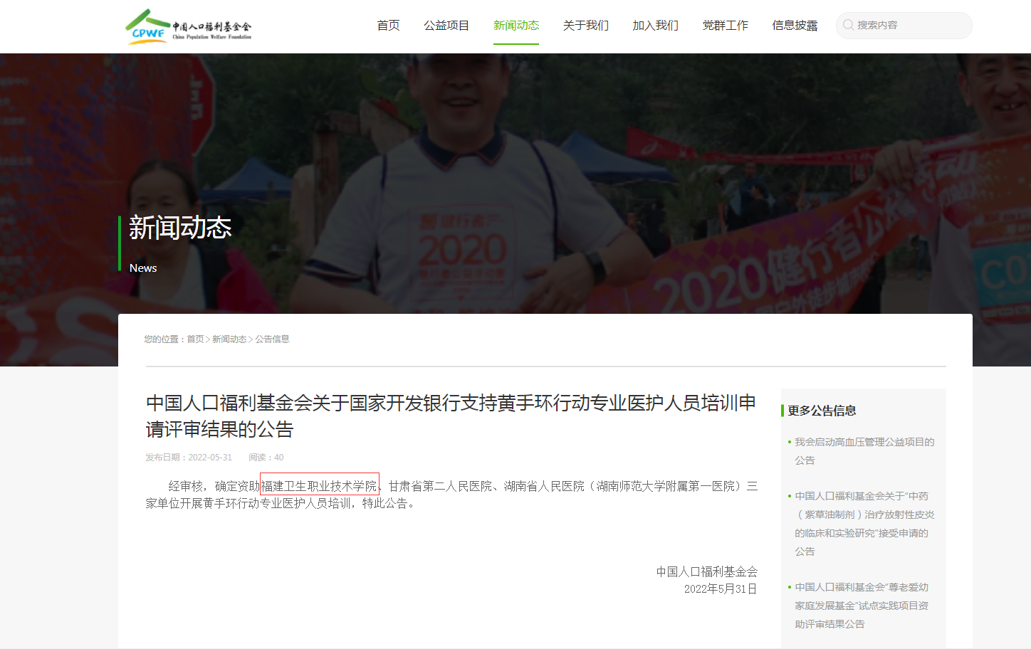 2022年5月31日,中国人口福利基金会公布关于国家开发银行支持黄手环行动专业医护人员培训评审结果,我校获批开展黄手环行动专业医护人员培训,全国仅三家单位获此资格。