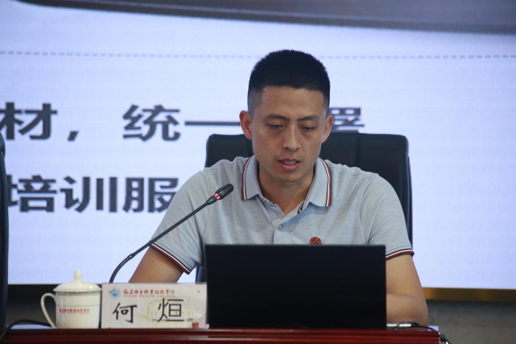 何烜代表福建省医疗护理员培训中心通报了2021年福建省医疗护理员培训工作的完成情况、主要工作成效、存在问题及举措等,并详细部署了2022年全省医疗护理员培训工作。
