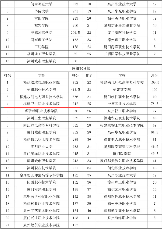 2022年12月4日,福建省第十七届运动会在南平市圆满闭幕。我校代表队参加大学生部田径、啦啦操、武术套路、定向越野、健身气功、跳绳和足球7大项比赛。经过全体教练员的悉心指导和运动员们的奋勇拼搏,我校在全省46所高职院校中脱颖而出,最终位列丙组积分榜第4,丙组奖牌榜第5,共获得28枚奖牌,其中金牌11枚,银牌17枚,并荣获5项体育道德风尚奖,成绩再创历史新高!