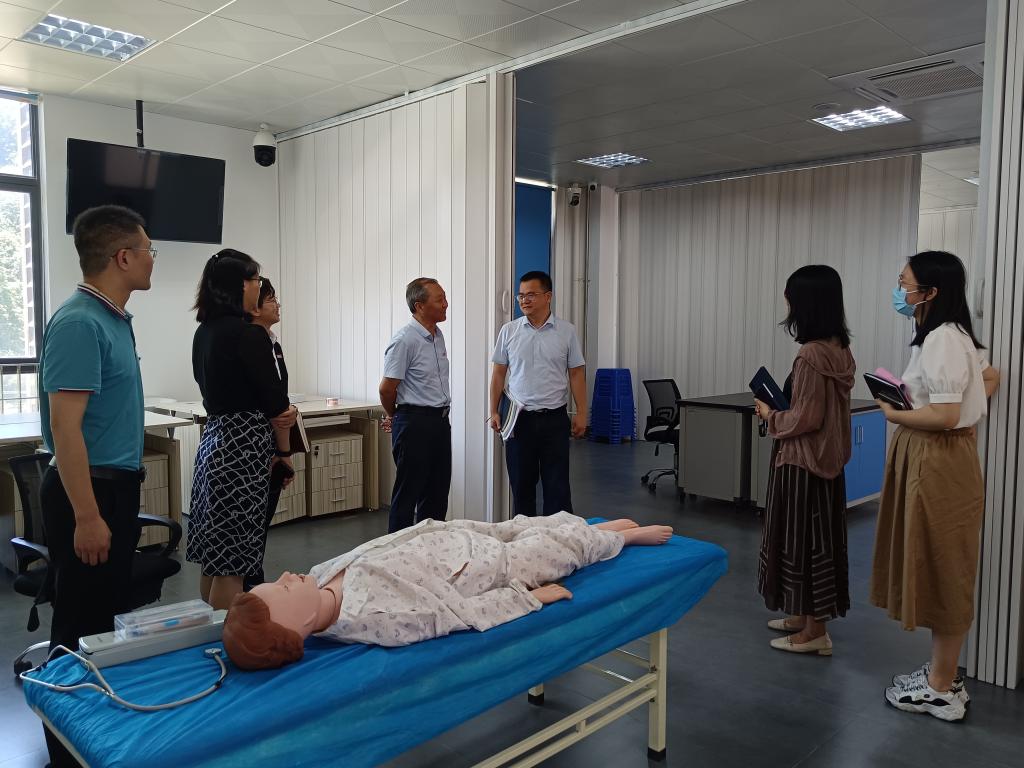 教务处负责人李淼淼提出,一要落实落细目前教学存在的问题,希望两校通过交流协商,做好转段考试工作;二要通过师资支援、集体备课、专业指导等方面的学习与磨合,不断找准契合高本贯通临床医学专业学生的教学模式,切实提高教学水平与效果。刘豫瑞表示,一方面,要提升教学管理质量,优化人才培养方案,保障转段考试工作,优选实习实训资源,鼓励学生参与技能竞赛,安排教师参与集体备课,协助培训技能考核标准化病人(SP);另一方面,要联合加强学生管理水平,重点在学生学习目标、人生规划、心理压力等方面下功夫,加强两校学生间的互动交流,进一步增强学生的归属感。刘豫瑞一行还实地考察了临床医学专业实训基地,重点了解转段考试课程《诊断学》技能考核实训条件。