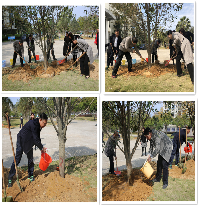 为贯彻落实党的十九大对生态文明建设作出的战略部署,建设美丽校园,我院组织开展“让绿色妆点校园,让师生共享美丽”主题植树活动。 3月12日上午,曾武祈书记、苏友新院长等院领导带领各职能部门、各系部负责人及学生代表参加本次植树活动。活动现场众人热情高涨,扬镐挥铲,培土浇水,一片热火朝天而又井然有序的景象。大家用实际行动为美丽校园建设再添一抹绚丽的绿意。