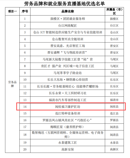 日前,福州市人力资源和社会保障局公布“一县一品”劳务品牌和就业服务直播基地优选结果名单。我校“闽侯福卫康护匠坊”凭借在医药卫生技能人才培养领域的深厚积累与创新实践,成功入选福州市闽侯地区唯一一个劳务品牌,标志着我校在推动地方技能人才队伍建设、服务地方产业发展方面迈上了新台阶。