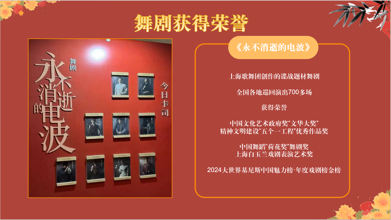 第2期展播内容,选取上海歌舞团出品的谍战题材舞剧《永不消逝的电波》。该剧屡获重要奖项,包括中国文化艺术政府奖“文华大奖”、精神文明建设“五个一工程”优秀作品奖、中国舞蹈“荷花奖”舞剧奖等权威荣誉。该剧曾赴多个国家进行文化交流演出,吸引了众多国际观众与专业评论家的赞赏,成为中国文化“走出去”的成功范例之一。