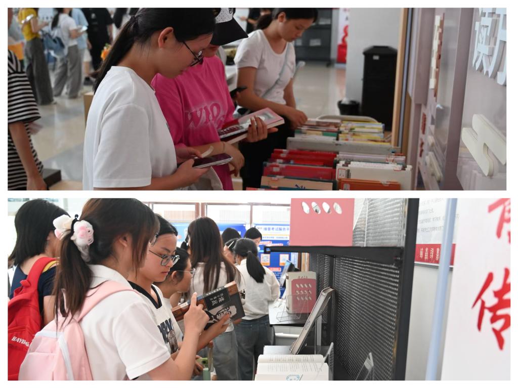 戏剧展播结束后,同学们前往臻善楼一楼大厅借阅相关图书。