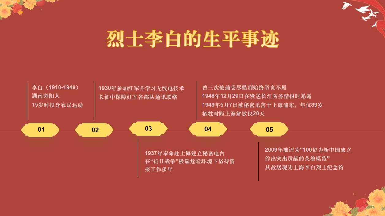 李白,中共隐蔽战线杰出战士。15岁积极投身农民运动,1930年参加红军并学习无线电技术,成为我军首批无线电通讯员之一。1937年奉命赴上海建立秘密电台,在“抗日战争”极端危险环境下坚持情报工作多年,三次被捕受尽酷刑始终坚贞不屈,牺牲时年仅39岁。