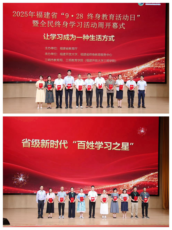 2025年福建省“9·28终身教育活动日”暨全民终身学习活动周开幕式于9月25日在三明举行,本次活动由福建开放大学、福建省终身教育服务中心与三明市教育局、三明教育学院(福建开放大学三明学院)联合承办。活动期间,我校教师代表荣幸受邀参与了开幕式主会场活动,同时我校在各院(部)设立了分会场,组织全校师生共同观看了这一盛况。