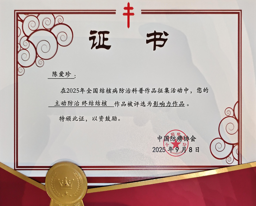 近日,中国防痨协会公布了《关于发布2025年全国结核病防治科普作品征集活动结果和宣传推广的通报》,公共卫生与健康管理学院陈爱珍老师创作的科普作品《主动防治 终结结核》,从全国1931件参赛作品中脱颖而出,荣获最佳科普作品中的“影响力作品”。