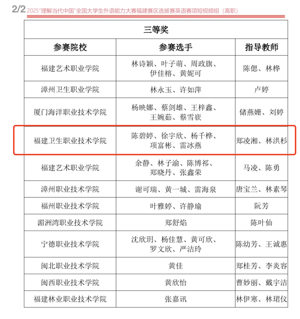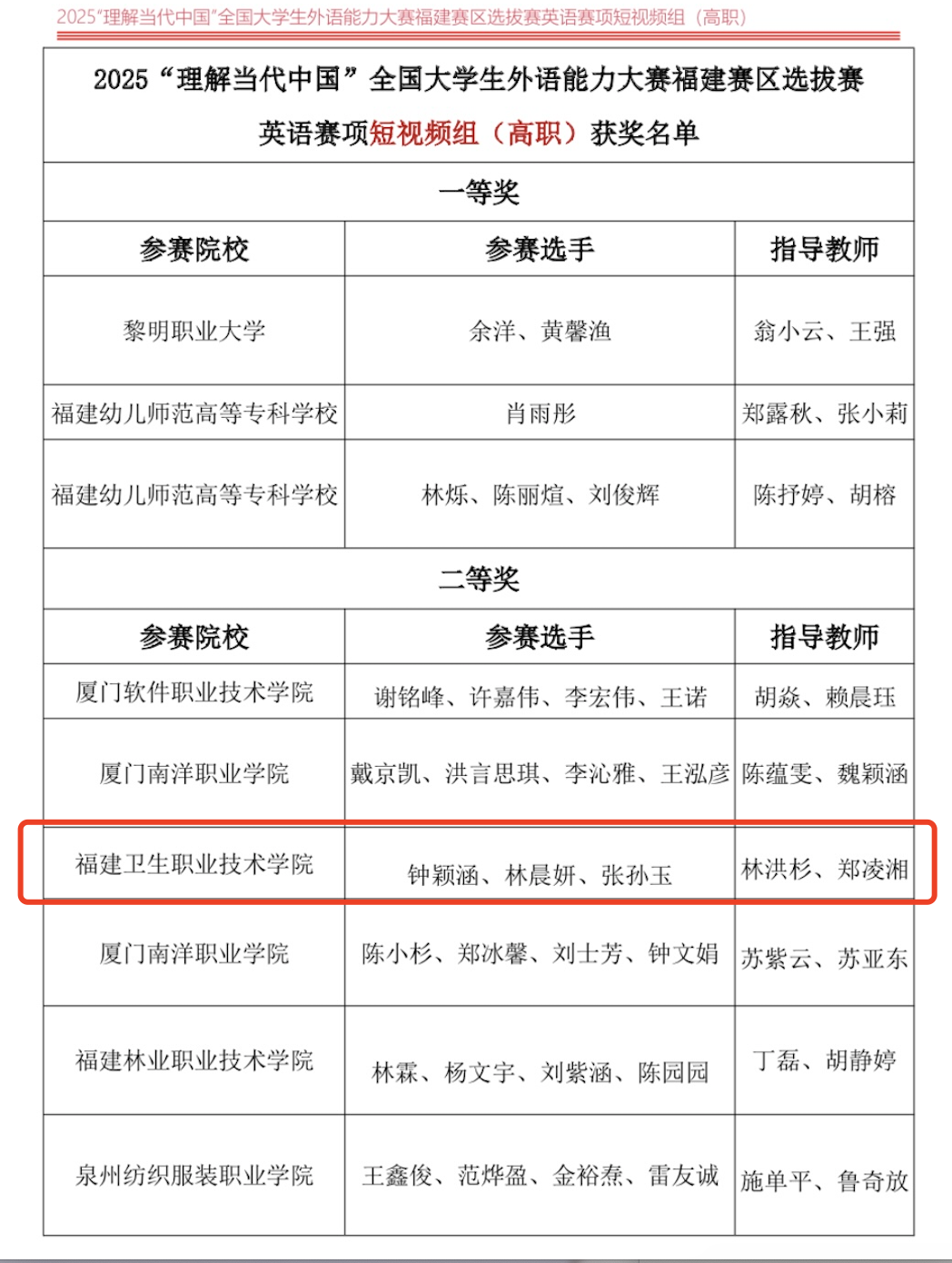 近日,2025年“外研社∙国才杯”“理解当代中国”全国大学生外语能力大赛福建赛区英语赛道短视频组线下评审会在华侨大学圆满落幕。我校学子凭借扎实的外语功底、新颖的创作理念与鲜明的专业特色脱颖而出,荣获二等奖和三等奖,充分展现了闽卫学子跨文化传播能力与蓬勃的青春活力。