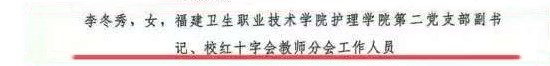 李冬秀,中共党员,福建卫生职业技术学院护理学院第二党支部副书记、教师,红十字会会员。