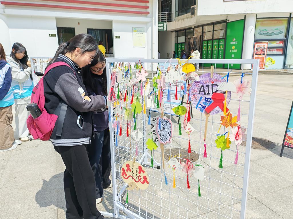 活动现场的手作展区亮点纷呈,一件件饱含深意的作品令人驻足。印有防艾标语的帆布袋、绘有红丝带与科普插画的文化衫、写着“预防艾滋”“为艾发声”的祈福留言,还有充满巧思的手工扇与主题海报……每一件作品都凝聚着同学们对防艾知识的理解与对健康生活的向往。