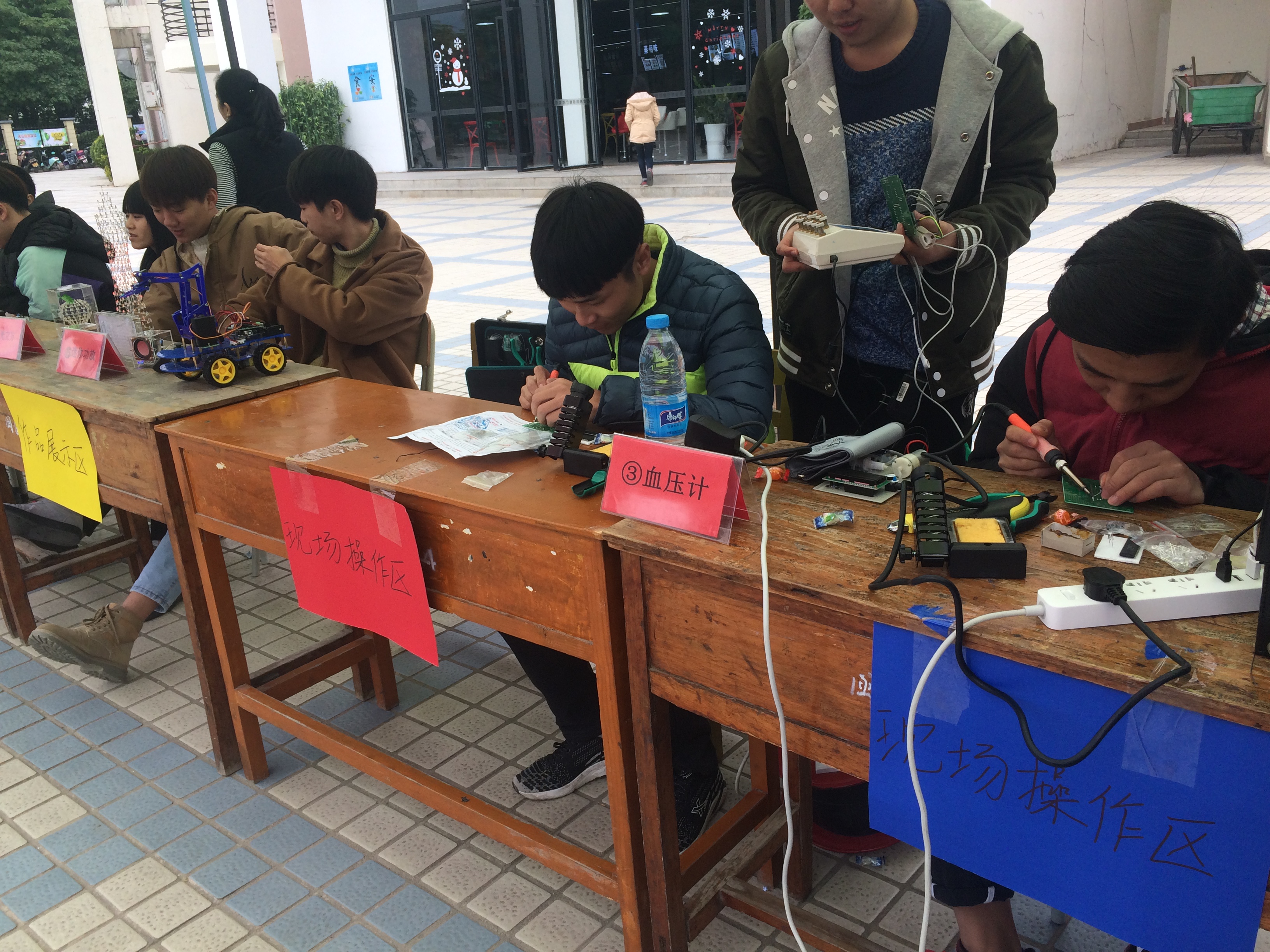 为深入贯彻落实十九大精神,推动“两学一做”教育活动常态化和制度化,弘扬“大众创业,万众创新”的时代风尚,充分发挥我系医疗设备应用技术专业的特长和优势,展现“工匠精神”,在学院和系部领导的关心和大力支持下, 1月25日上午11时至下午14时,医学技术系医疗设备专业的教师党员和全体学生在明湖餐厅门前广场开展了以“医疗家用电子产品制作与维修”为主题的职教文化活动。