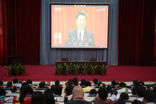 2017年10月18日上午9时,中国共产党第十九次全国代表大会在北京隆重召开。根据学院党委统一部署,院领导与全体师生党员近200人在学术厅通过电视直播收看十九大开幕会,认真聆听习近平总书记的报告,并认真做摘录笔记。因公因事未能收看直播的党员,学院另行安排收看转播。