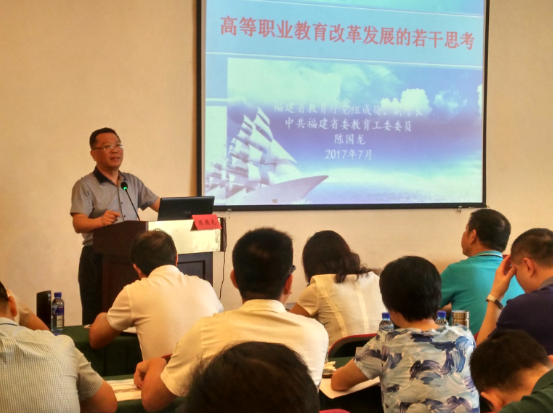 开班仪式上福建省教育厅党组成员、副厅长陈国龙同志应邀来我院作题为《高等职业教育改革发展的若干思考》的专题讲座,从我省职业教育的发展历程、改革任务两个方面展开,强调高职院校要坚持需求导向、问题导向、效果导向,努力办专办特办优,我省将继续坚持“补短板、抓内涵、创特色、树品牌”,努力把职业教育提升到新的水平。