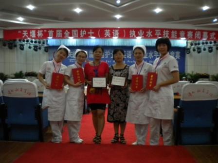 2011年8月21日至23日,“天堰杯”首届全国护士(英语)执业水平技能竞赛在山东省滨州市举行,来自全国各地53家院校的59支队伍参加了大赛。我院护理系代表队四名参赛选手(07涉外护理501班王超、09护理301班卓芳、09助产301班林宇、07涉外护理502班陈丽)精心备战,稳定发挥,取得高职组团体总分二等奖、团体技能操作成绩二等奖、团体理论成绩三等奖的优异成绩!参赛领队护理系刘登蕉主任获得“优秀组织者”荣誉称号,指导教师李淼淼荣获“优秀指导教师” 荣誉称号!(护理系)