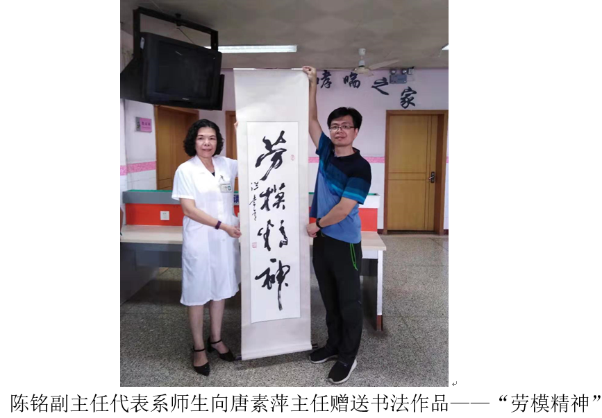 学生们在与医生的零距离接触中,深入了解了平日的医疗和医院工作,体验了医生的辛劳与职业的崇高感。在“医学课堂”里,新生儿护士的一线言传身教、在影像科里探秘“黑白照片”的神奇、在泌尿外科聆听医生的现场教学……这些难得深入一见的医学场景,让孩子们大开眼界,加深了对医学的认知。值此医师节之际,我院临床系陈洁副书记和陈铭副主任代表系全体师生向唐素萍主任献上院工会副主席书法作品“劳模精神”,以表敬意和感谢。