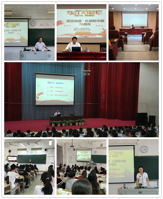 9月5日至12日,福建卫职院党委书记曾武祈、院长苏友新、副书记李美华、纪委书记游峰、副院长陈贞健、黄铭珊和郑翠红等校领导纷纷走上讲台,为全校各系新老生讲授以《坚定自信·礼赞中华人民共和国成立70周年》为主题的形势与政策开学第一课。