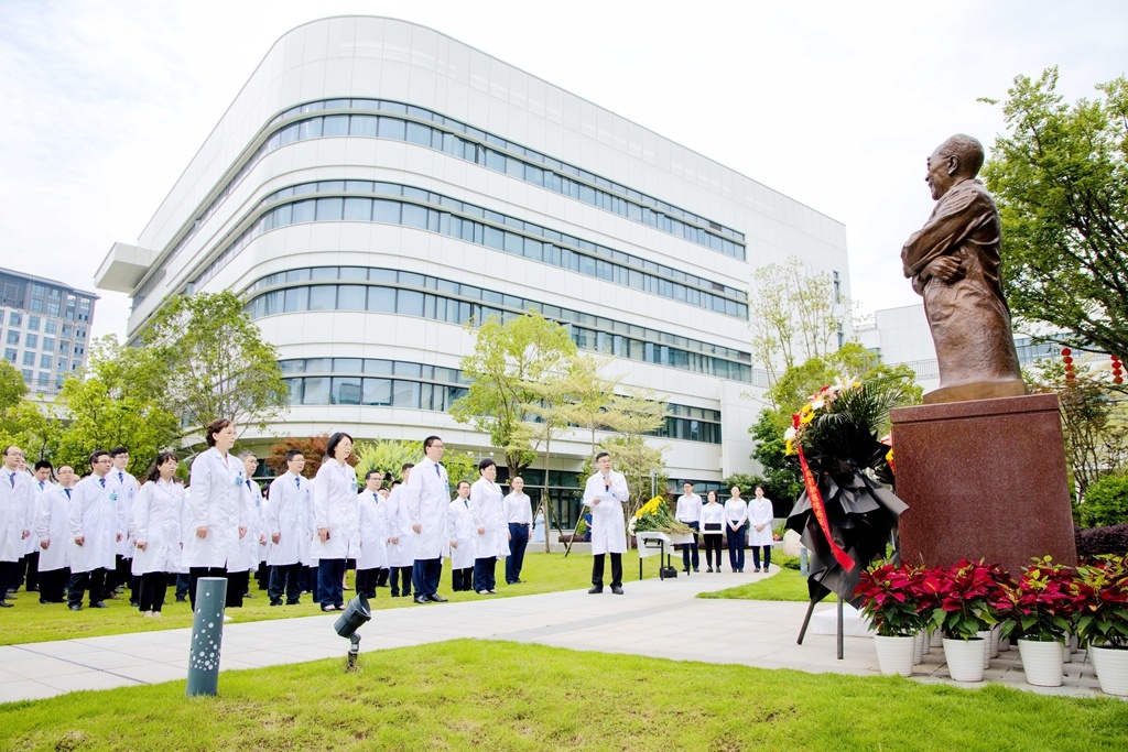 “吴老用生命书写的‘三爱情怀’(爱党、爱国、爱民)和‘四勇(永)精神’(勇闯禁区、勇于创新、永不满足、永远争先),犹如一盏永不熄灭的明灯,照亮着我们每一位后来者的从医之路,这些精神瑰宝,需要我们用心守护、用行动传承……”伴随着一段追忆,昨日清晨7时30分,孟超肝胆医院金山院区孟超园内,医护人员、科研人员、职工、患者和家属代表神情肃穆,在吴老铜像前默哀、献花,共同追忆他的崇高风范,传承他的科学家精神。
