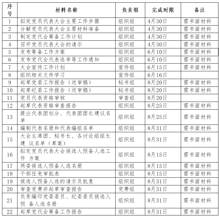 3.各二级党组织和各有关部门、单位要按照学校党员代表大会筹备工作领导小组及各工作小组的安排部署,高度重视,认真谋划,合理安排,积极配合,保证各项工作任务落到实处。