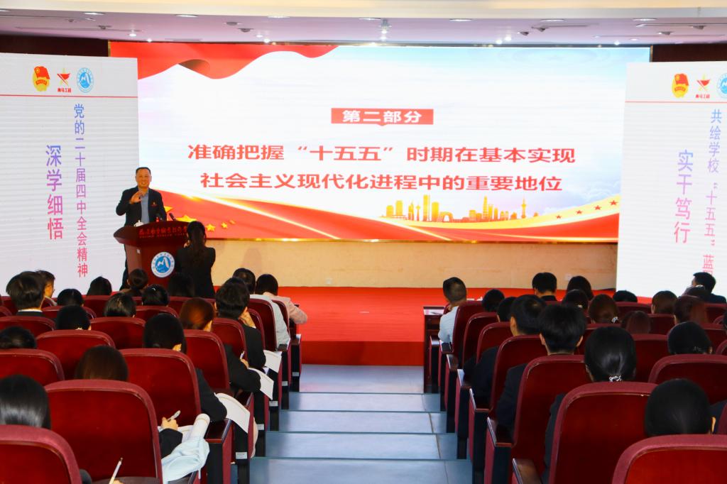 宣讲开篇,曾武祈从历史维度、战略维度、实践维度,系统阐述了党的二十届四中全会的重大意义。他强调,2025年作为“十四五”收官与“十五五”谋划的关键节点,此次全会审议通过的纲领性文件,为学校在基本实现社会主义现代化进程中找准定位、主动作为提供了根本遵循。在宣讲主体部分,曾武祈聚焦全会精神核心要义,紧扣教育强国、教育强省建设使命任务展开针对性解读,深入阐释“十五五”时期经济社会发展的指导思想、核心原则与重点部署。立足学校发展实际,曾武祈将全会精神与学校第三次党代会精神深度融合,围绕全会提出的“加快高水平科技自立自强”“统筹教育强国建设”“强化现代化建设人才支撑”等重要论述,精准剖析学校在职教底色、健康本色、服务特色等方面的优势和职责使命,明确学校未来五至十年特别是“十五五”时期的发展思路和重点任务。