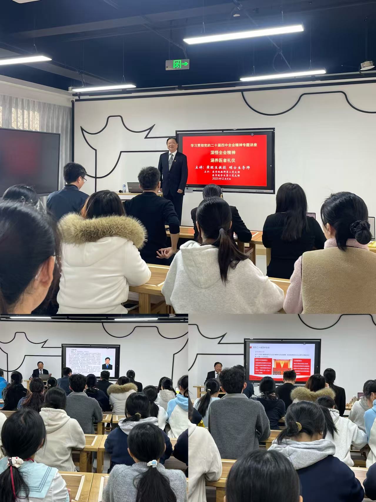讲座紧扣党的二十届四中全会精神,从把握“两个大局”、引领党员师生担当使命、提升医者礼仪素养、促进党建与业务深度融合等方面进行了系统解读。黄旺生强调,党员教师要在政治引领、专业发展、师德师风上走在前,主动把党的二十届四中全会精神融入课程思政和教育教学实践中;要以良好医者礼仪服务患者、塑造职业形象、构建和谐医患关系;要把党建工作贯穿教学科研与人才培养全过程,通过制度建设与治理效能提升推动医药高职教育高质量发展。